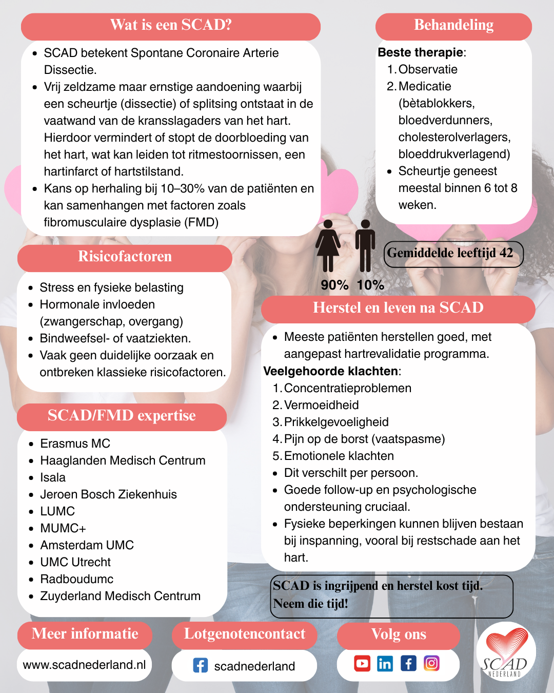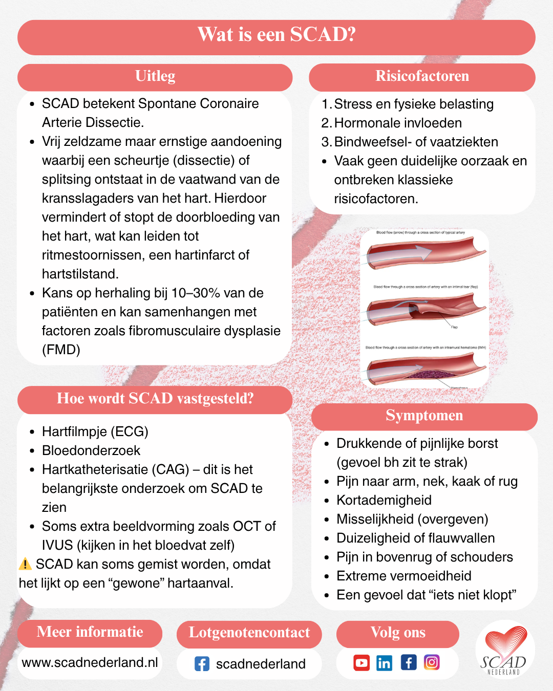Een SCAD is een zeldzame maar ernstige aandoening waarbij er een scheur of splitsing ontstaat in de wand van een van de kransslagaders, die bloedvaten die het hart van zuurstofrijk bloed voorzien. Deze scheur kan leiden tot een belemmering van de bloedstroom naar het hart, wat resulteert in een hartinfarct, ritmestoornissen of in sommige gevallen een plotselinge hartstilstand. SCAD treft vaak jonge en gezonde vrouwen. Van alle SCAD events is ongeveer 90% vrouw en 10% man. De gemiddelde leeftijd is 42 jaar.