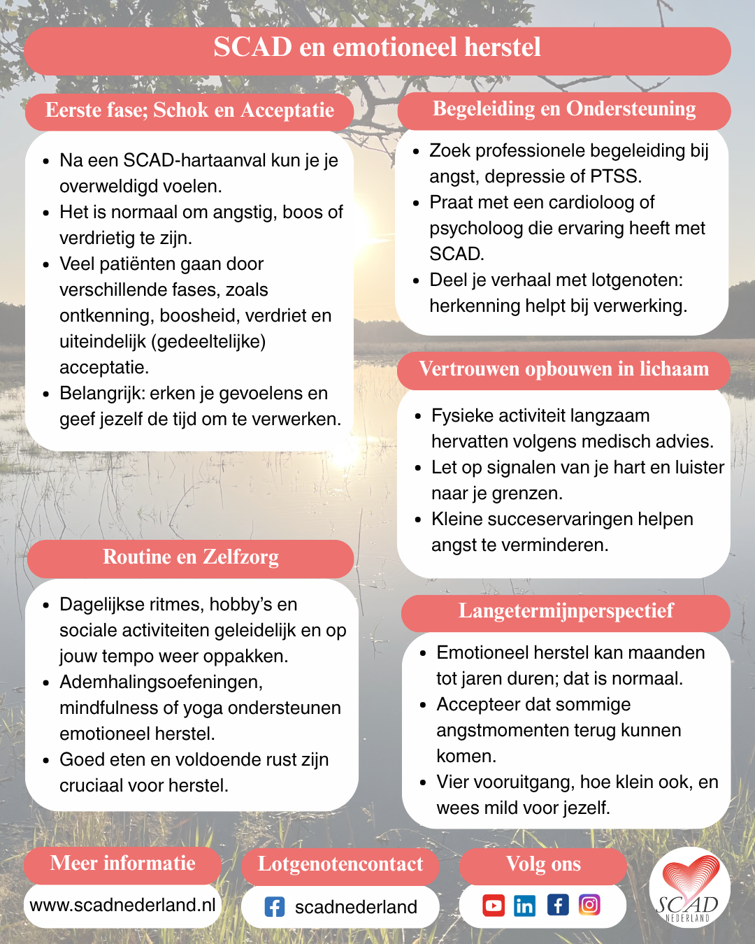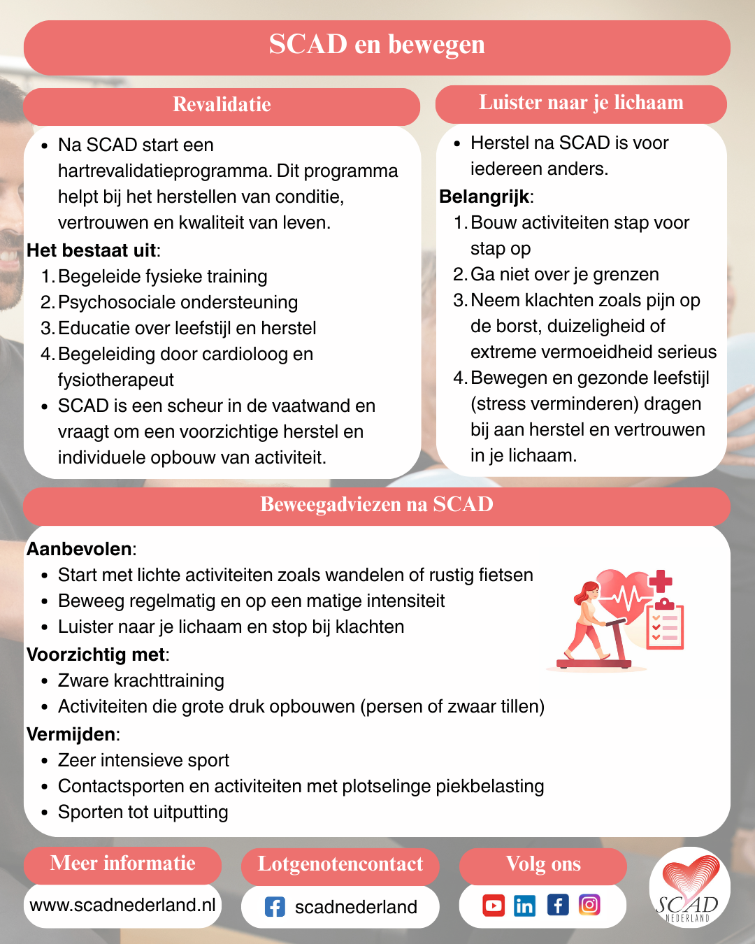 Voor SCAD-patiënten: Heb je onlangs of langer geleden een SCAD gehad? Wil je meer weten over de aandoening, risicofactoren, behandelingen en revalidatie? Zoek je contact met lotgenoten en herkenning? Je bent hier op de juiste plek. Ontdek verhalen van anderen en vind antwoorden op je vragen.